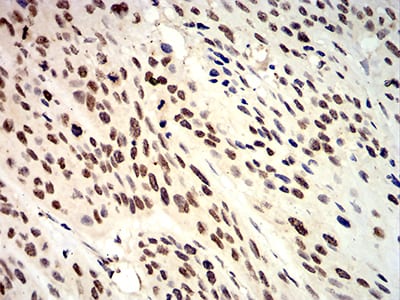 Immunohistochemical analysis of paraffin-embedded human esophageal cancer tissues using ANAPC10 mouse mAb with DAB staining.