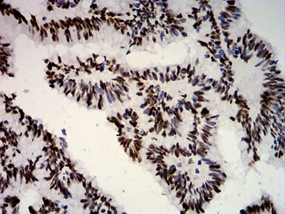 Immunohistochemical analysis of paraffin-embedded human colon cancer tissues using ESR1 mouse mAb with DAB staining.