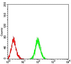 Flow cytometric analysis of Jurkat cells using ATG3 mouse mAb (green) and negative control (red).
