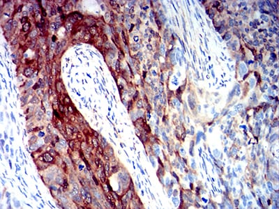 Immunohistochemical analysis of paraffin-embedded human cervical cancer tissues using ALDH1A1 mouse mAb with DAB staining.