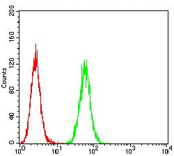 Immunofluorescence analysis of Hela cells using P2RY8 mouse mAb (green). Blue: DRAQ5 fluorescent DNA dye. Red: Actin filaments have been labeled with Alexa Fluor- 555 phalloidin. Secondary antibody from Fisher (Cat#: 35503)