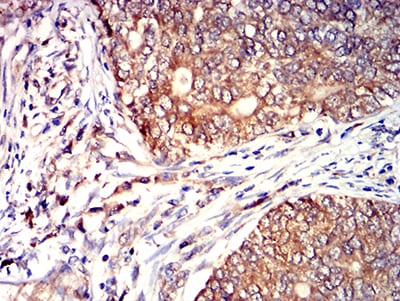 Immunohistochemical analysis of paraffin-embedded human cervical cancer tissues using CD53 mouse mAb with DAB staining.
