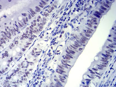 Immunohistochemical analysis of paraffin-embedded human rectum cancer tissues using CTNNBL1 mouse mAb with DAB staining.