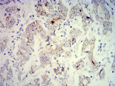 Immunohistochemical analysis of paraffin-embedded human stomach cancer tissues using PCK2 mouse mAb with DAB staining.