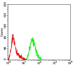 Flow cytometric analysis of Hela cells using PCK2 mouse mAb (green) and negative control (red).
