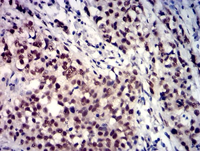 Immunohistochemical analysis of paraffin-embedded human bladder cancer tissues using TBP mouse mAb with DAB staining.