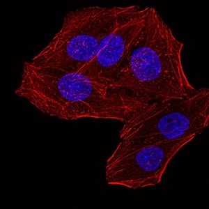 Immunofluorescence analysis of Hela cells using RBBP7 mouse mAb. Blue: DRAQ5 fluorescent DNA dye. Red: Actin filaments have been labeled with Alexa Fluor- 555 phalloidin.