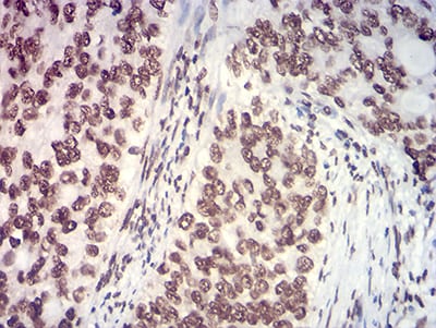 Immunohistochemical analysis of paraffin-embedded human cervical cancer tissues using NAGR1 mouse mAb with DAB staining.