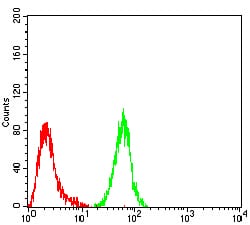 Flow cytometric analysis of Hela cells using NAGR1 mouse mAb (green) and negative control (red).