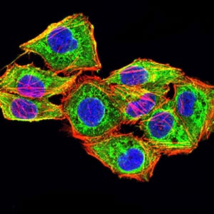 Immunofluorescence analysis of Hela cells using CNN3 mouse mAb (green). Blue: DRAQ5 fluorescent DNA dye. Red: Actin filaments have been labeled with Alexa Fluor- 555 phalloidin. Secondary antibody from Fisher (Cat#: 35503)