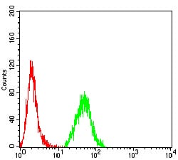 Flow cytometric analysis of Hela cells using CNN3 mouse mAb (green) and negative control (red).