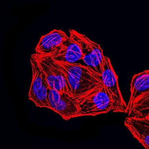 Immunofluorescence analysis of Hela cells using MSH2 mouse mAb. Blue: DRAQ5 fluorescent DNA dye. Red: Actin filaments have been labeled with Alexa Fluor- 555 phalloidin.