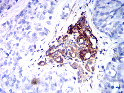 Immunohistochemical analysis of paraffin-embedded human bladder cancer tissues using ACTA2 mouse mAb with DAB staining.