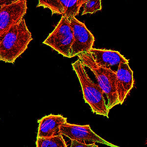 Immunofluorescence analysis of Hela cells using TET2 mouse mAb (green). Blue: DRAQ5 fluorescent DNA dye. Red: Actin filaments have been labeled with Alexa Fluor- 555 phalloidin. Secondary antibody from Fisher (Cat#: 35503)