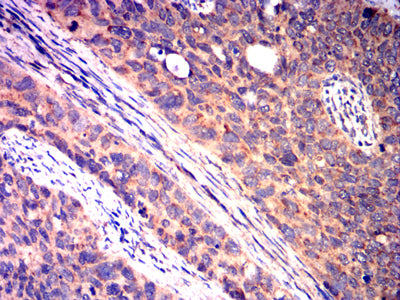 Immunohistochemical analysis of paraffin-embedded human cervical cancer tissues using CD40 mouse mAb with DAB staining.