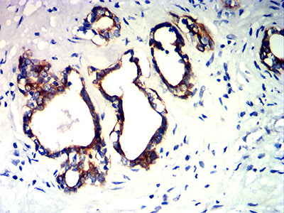 Immunohistochemical analysis of paraffin-embedded human prostate cancer tissues using KRT10 mouse mAb with DAB staining.
