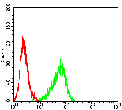 Flow cytometric analysis of A431 cells using KRT10 mouse mAb (green) and negative control (red).