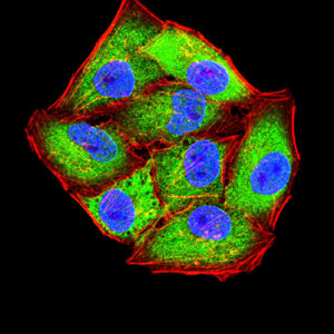 Immunofluorescence analysis of Hela cells using IL22 mouse mAb (green). Blue: DRAQ5 fluorescent DNA dye. Red: Actin filaments have been labeled with Alexa Fluor- 555 phalloidin. Secondary antibody from Fisher (Cat#: 35503)