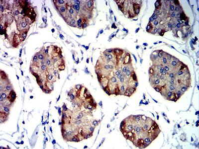 Immunohistochemical analysis of paraffin-embedded human stomach tissues using CD337 mouse mAb with DAB staining.