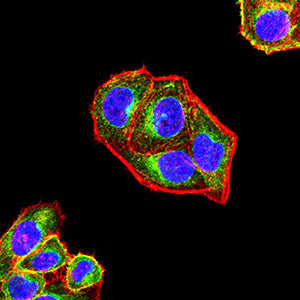 Immunofluorescence analysis of Hela cells using CD317 mouse mAb (green). Blue: DRAQ5 fluorescent DNA dye. Red: Actin filaments have been labeled with Alexa Fluor- 555 phalloidin. Secondary antibody from Fisher (Cat#: 35503)
