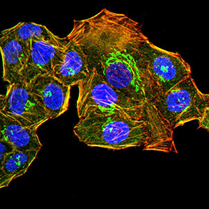 Immunofluorescence analysis of Hela cells using GOLGA2 mouse mAb (green). Blue: DRAQ5 fluorescent DNA dye. Red: Actin filaments have been labeled with Alexa Fluor- 555 phalloidin. Secondary antibody from Fisher (Cat#: 35503)