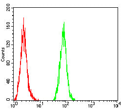 Flow cytometric analysis of Hela cells using GOLGA2 mouse mAb (green) and negative control (red).