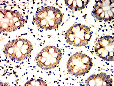 Immunohistochemical analysis of paraffin-embedded human colon tissues using GOLGA2 mouse mAb with DAB staining.