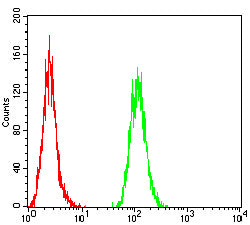 Flow cytometric analysis of Hela cells using GOLGA2 mouse mAb (green) and negative control (red).