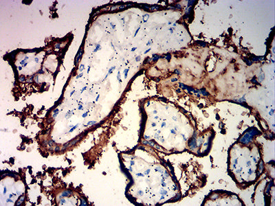 Immunohistochemical analysis of paraffin-embedded human placenta tissues using ALPG mouse mAb with DAB staining.