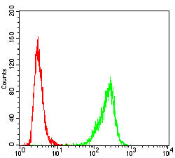 Flow cytometric analysis of Hela cells using USP7 mouse mAb (green) and negative control (red).