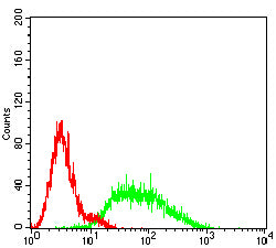 Flow cytometric analysis of HT-29 cells using GPR83 mouse mAb (green) and negative control (red).