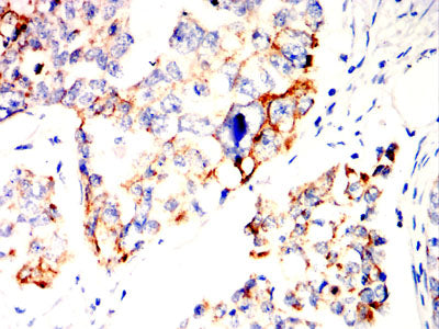 Immunohistochemical analysis of paraffin-embedded human ovarian cancer tissues using SOCS3 mouse mAb with DAB staining.