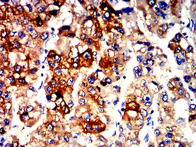 Immunohistochemical analysis of paraffin-embedded human liver cancer tissues using ALDH1L1 mouse mAb with DAB staining.