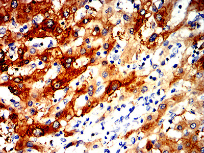 Immunohistochemical analysis of paraffin-embedded human liver cancer tissues using ALDH1L1 mouse mAb with DAB staining.