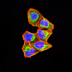 Immunofluorescence analysis of Hela cells using SOCS3 mouse mAb (green). Blue: DRAQ5 fluorescent DNA dye. Red: Actin filaments have been labeled with Alexa Fluor- 555 phalloidin. Secondary antibody from Fisher (Cat#: 35503)