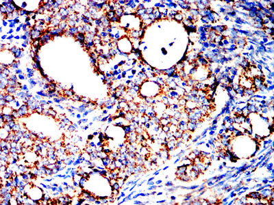 Immunohistochemical analysis of paraffin-embedded human cervical carcinoma tissues using HSPA9 mouse mAb with DAB staining.
