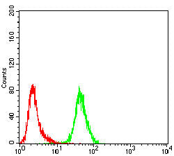 Flow cytometric analysis of Jurkat cells using HSPA9 mouse mAb (green) and negative control (red).