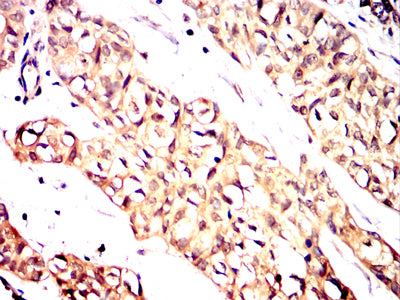Immunohistochemical analysis of paraffin-embedded human bladder cancer tissues using MTDH mouse mAb with DAB staining.