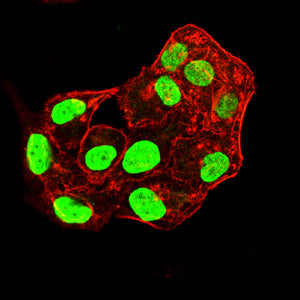 Immunofluorescence analysis of Hela cells using H2AFX mouse mAb (green). Blue: DRAQ5 fluorescent DNA dye. Red: Actin filaments have been labeled with Alexa Fluor- 555 phalloidin. Secondary antibody from Fisher (Cat#: 35503)
