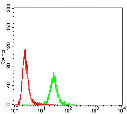 Flow cytometric analysis of Hela cells using H2AFX mouse mAb (green) and negative control (red).