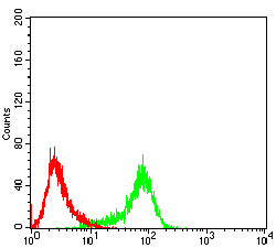 Flow cytometric analysis of Jurkat cells using RAD23B mouse mAb (green) and negative control (red).