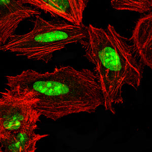 Immunofluorescence analysis of Hela cells using NPM3 mouse mAb (green). Blue: DRAQ5 fluorescent DNA dye. Red: Actin filaments have been labeled with Alexa Fluor- 555 phalloidin. Secondary antibody from Fisher (Cat#: 35503)