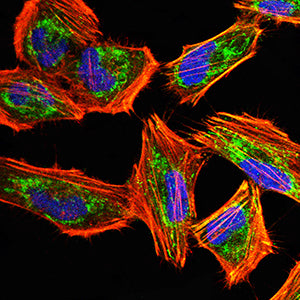Immunofluorescence analysis of Hela cells using IRF3 mouse mAb (green). Blue: DRAQ5 fluorescent DNA dye. Red: Actin filaments have been labeled with Alexa Fluor- 555 phalloidin. Secondary antibody from Fisher (Cat#: 35503)