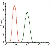 Flow cytometric analysis of A549 cells using DCTN4 mouse mAb (green) and negative control (red).