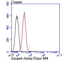 Flow cytometric analysis of HepG2 cells with Zscan4 antibody at 1/100 dilution (red) compared with an unlabelled control (cells without incubation with primary antibody; black). Alexa Fluor 488-conjugated goat anti-mouse IgG was used as the secondary antibody.